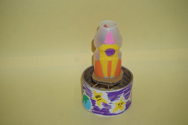 - ガムテープ芯、ヤクルト容器を使ってゴムの力で飛び出すロケットを作ります。