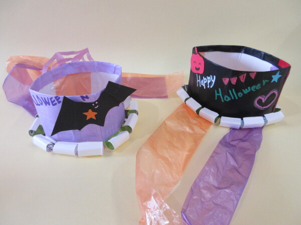 - ハロウィンの帽子を牛乳パックでつくって、折り紙やスズランテープで飾り付けます。