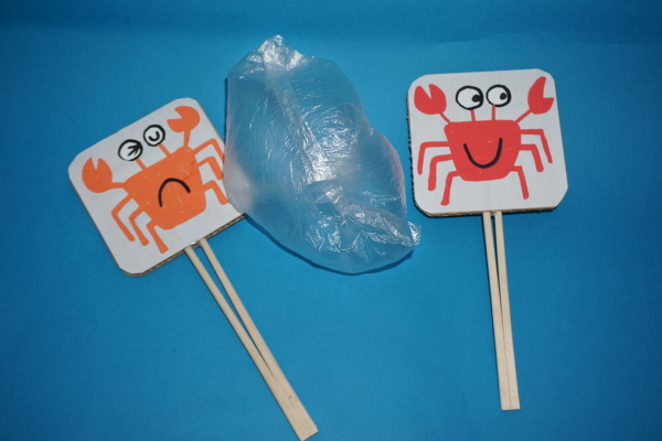 - ダンボールと割りばしをを使って工作し、空気を入れたビニール袋をポンポンと遊びます。