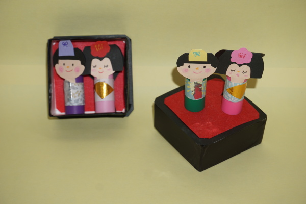 - ポスカの廃棄キャップを再利用しておひなさなをつくり、指人形にします。牛乳パックの再利用の箱入りです。