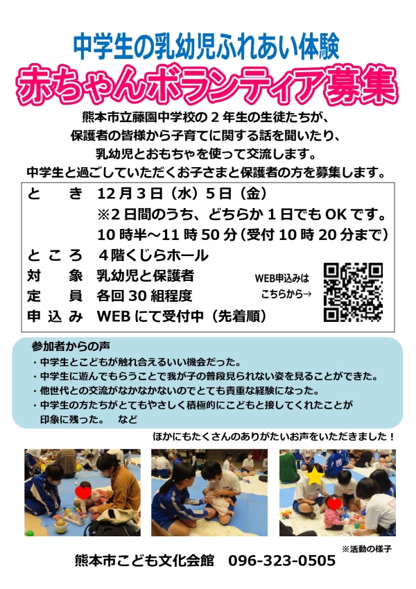 藤園中学校のお兄さんやお姉さんと一緒に遊んでくれる赤ちゃんボランティアを募集いたします。