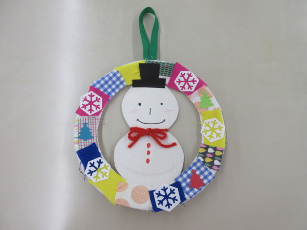 - 紙皿、ハギレ、毛糸等を使って雪だるまのクリスマスリースを作ります。