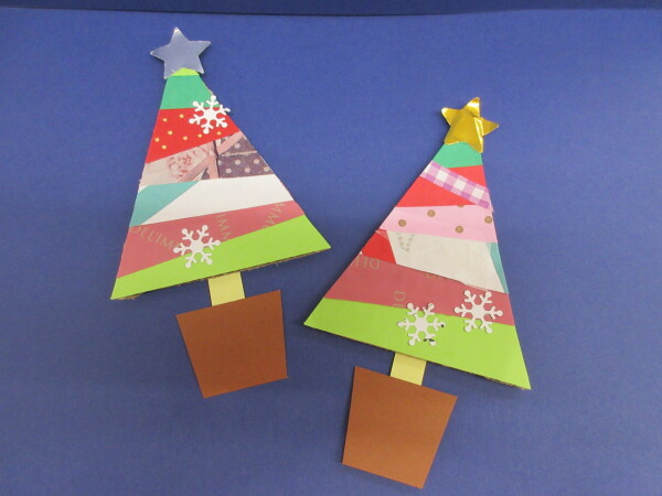 - ダンボールと色画用紙・包装紙でクリスマスツリーをつくり、きつつきの部屋に飾ります。